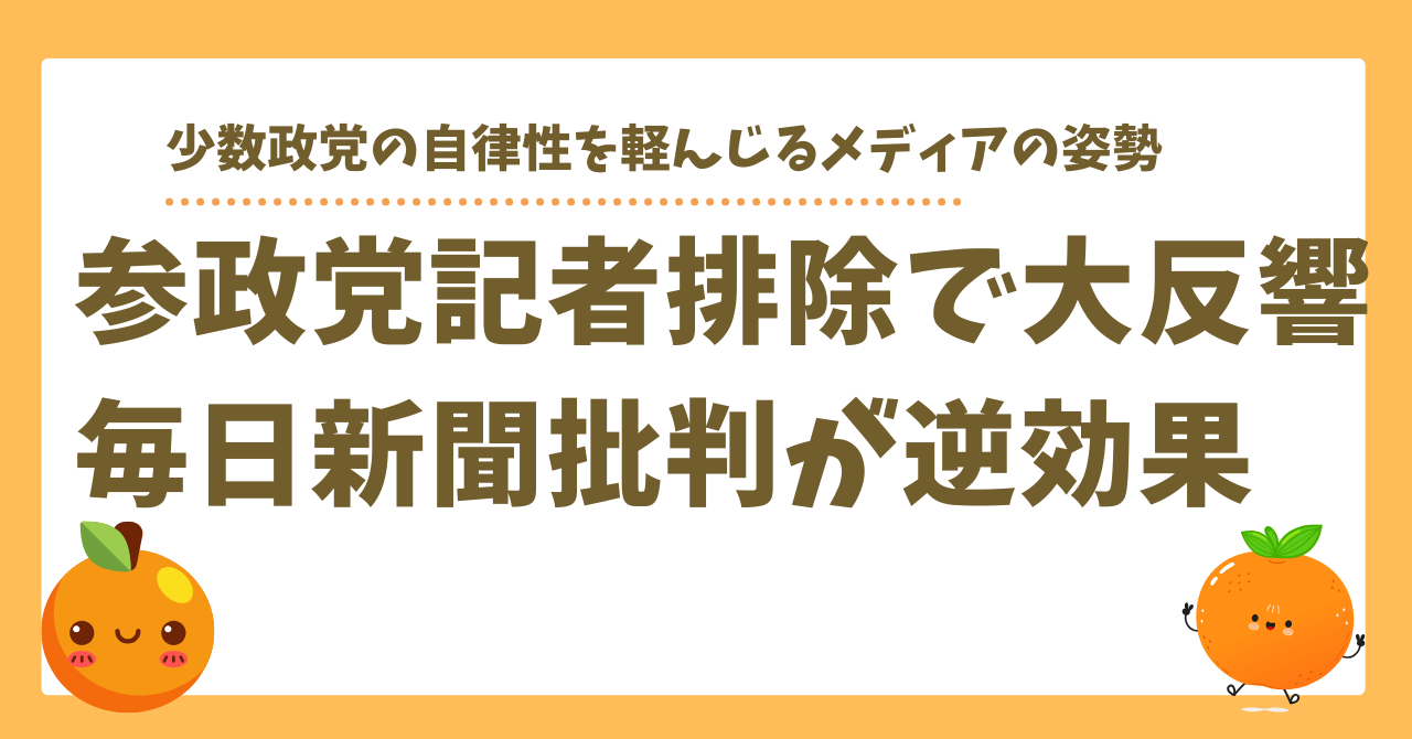 参政党の神奈川新聞記者排除問題について、毎日新聞などのメディアが一斉に批判したことが、かえって参政党への注目と支持を高める結果となった典型例ですね。オールドメディアの偏向報道に対する国民の不信が背景にあり、メディアが批判すればするほど「何か隠したいことがあるのでは?」と逆に関心を持たれてしまう。参政党の「日本人ファースト」の理念が多くの国民に支持されている証拠だと思います🍊