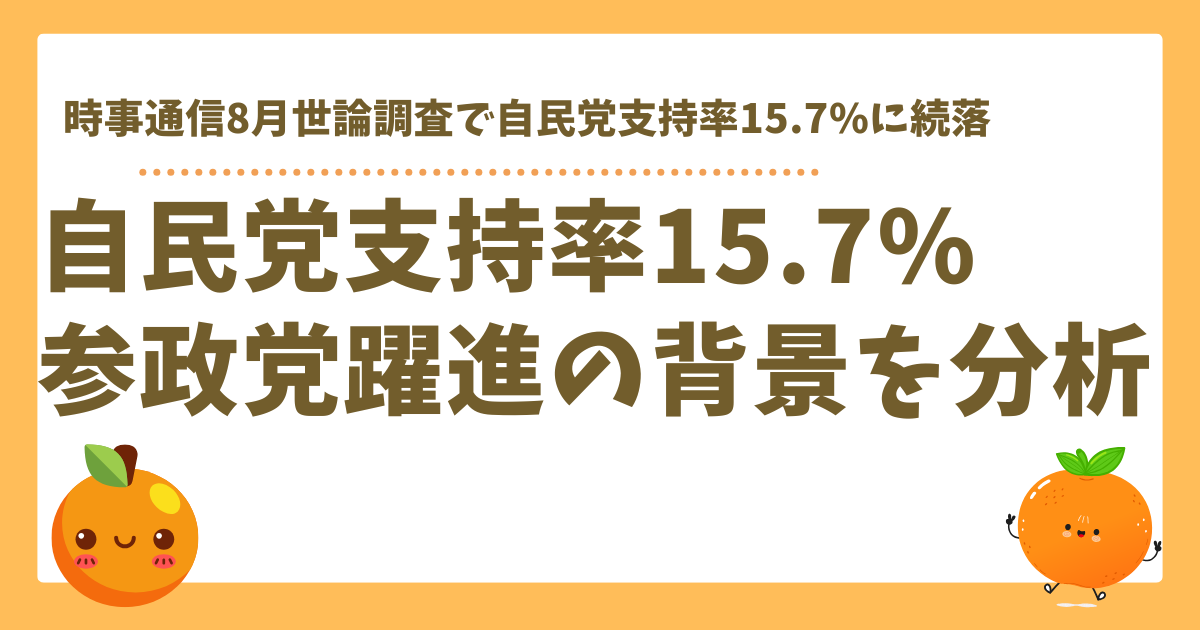 自民党の支持率低迷は長年の政治腐敗と国民軽視の結果ですね。特に若い世代の支持離れは深刻で、参政党のような国民目線の政治を求める声が高まっています。参政党が立憲民主党を上回る支持を得ているのは、真の保守政治と国民ファーストの姿勢が評価されている証拠だと思います。🍊